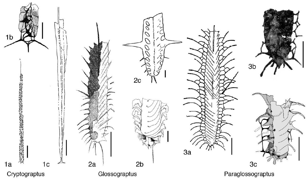 Fig. 220,3a. *P. typicalis, holotype, NIGP 10635, scale bar, 5 mm (Mu & Lee, 1960, fig. 127), Fig. 220,36. P. tentaculatus (Hall, 1865), GSC 138686, isolated, flattened specimen, Cow Head Group, western Newfoundland, Canada, scale bar, 1 mm (new), Fig. 220,3c. P. proteus (Harris & Thomas, 1935) GSC 23949, Daniels Harbour, western Newfoundland, Canada, scale bar, 1 mm (adapted from Whittington & Rickards, 1969, fig. 7)